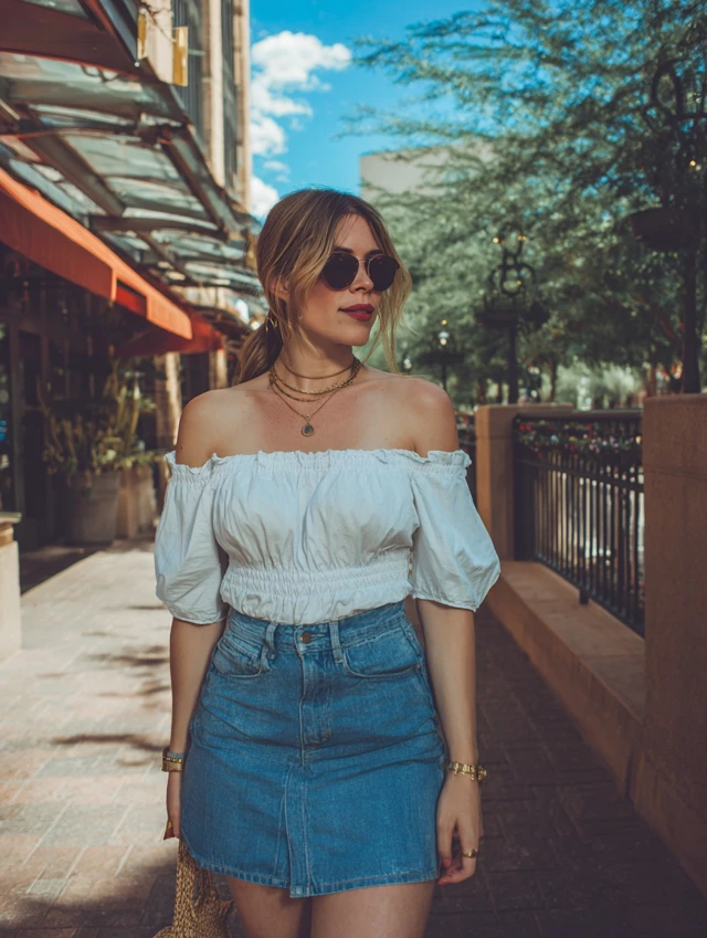 3. Denim Skirt + Off-Shoulder Top
