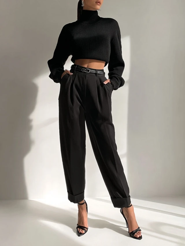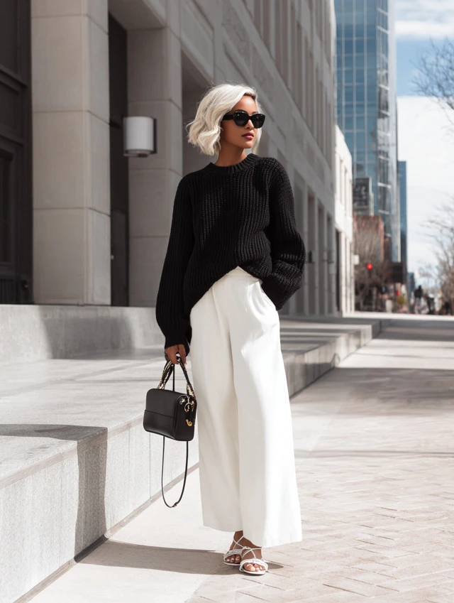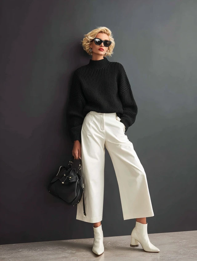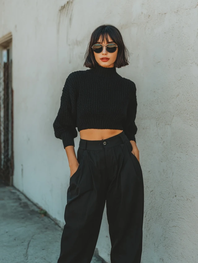 Black pairs seamlessly with everything—white for contrast, beige and gray for minimalism, or bold hues like red or emerald for drama. Chunky knits feel cozy, cropped sweaters add edge, and lightweight wool versions polish office looks.