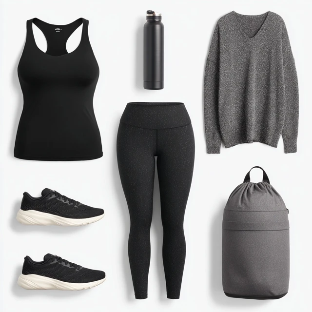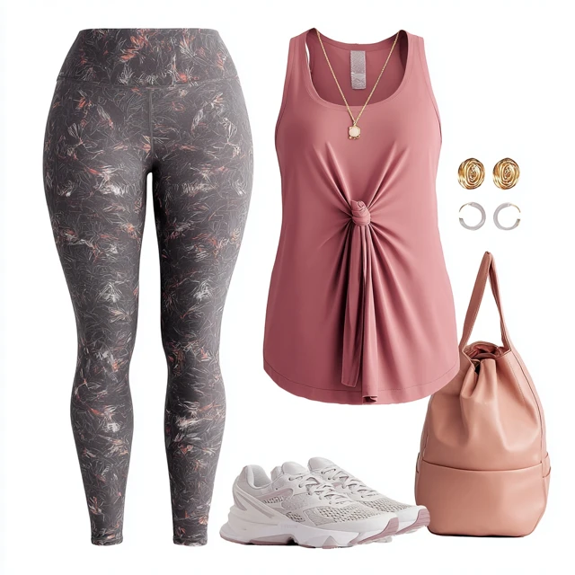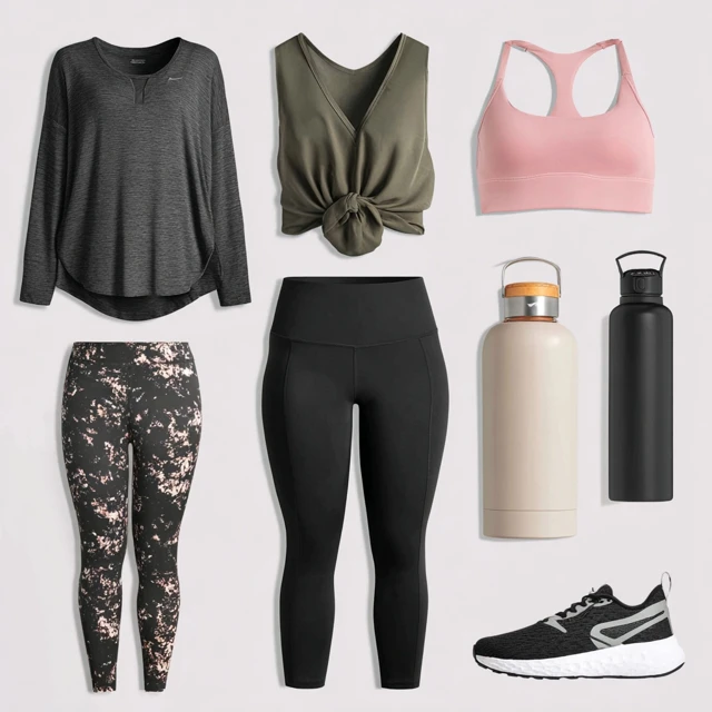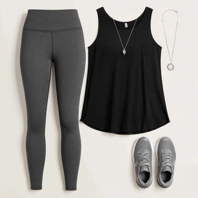 Why It Works: High-waist leggings provide tummy support and a sleek silhouette. A longline bra gives coverage without sacrificing breathability.